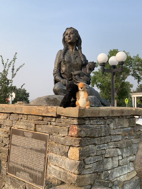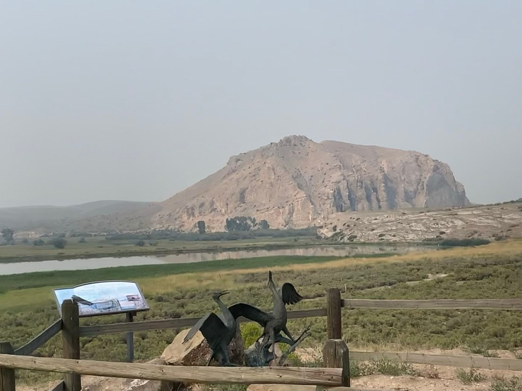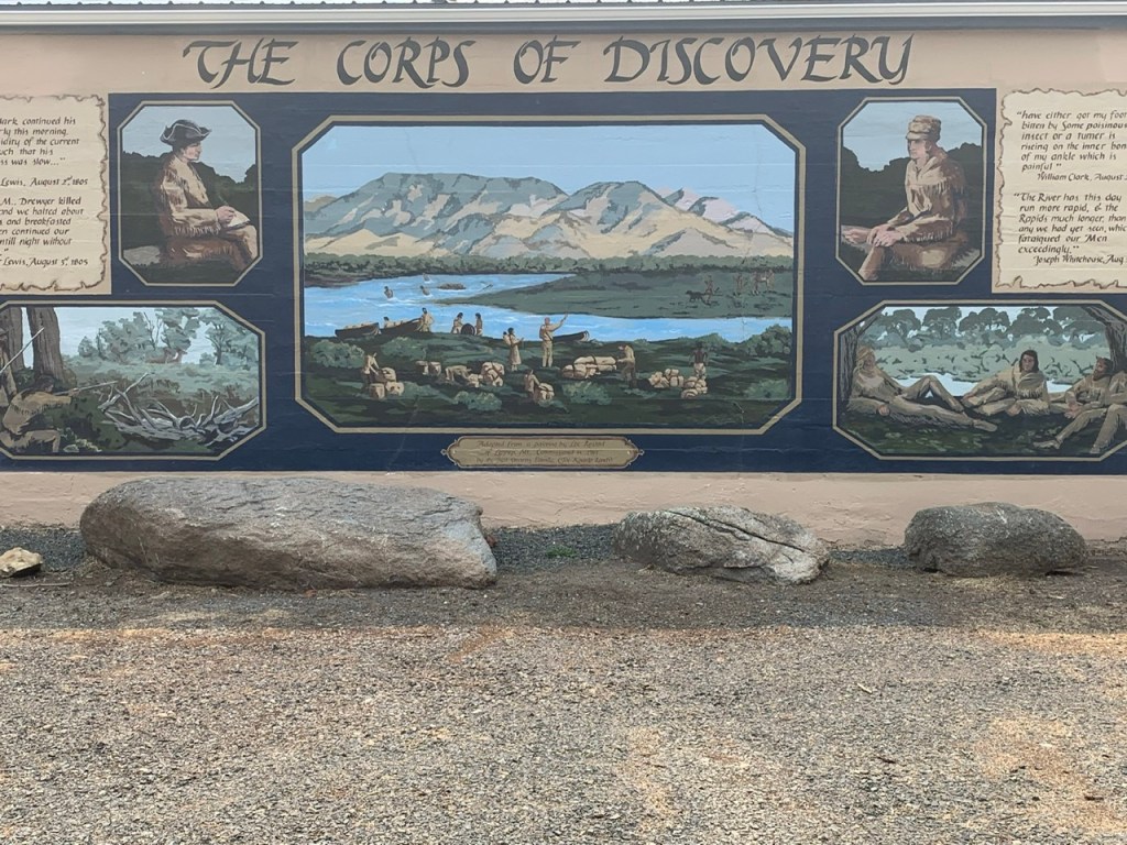 My mom dropped me off at the entrance of the Lewis and Clark Caverns the next morning. The roads still didn’t have much of a shoulder, but past the festival the traffic wasn’t quite so bad. I dealt with a lot of RVs angry that I had the audacity to bike on the road. I cruised up and down, stopping at occasional historic markers and trying to describe the scenery in my head. I made up some of the mileage I’d missed the day before. Months ago my mom sent me an article about murals in Montana that a town was looking to restore. The town was called Whitehall, and I hadn’t even thought about whether or not my trail went through there until suddenly we were in the town, and I started to see the murals. My mom and I took our lunch break there and drove from mural to mural taking quick photos before I got back on my bike and headed toward Dillon. Somewhere after that, purely by chance I found a Sacagawea interpretive park. Not long after that I reached Beaverhead Rock, the first landmark Sacagawea recognized on the journey West, and the first sign that her people, the Shoshone would be nearby. This was the first of a few instances where the map advertised a state park, but there was no entrance, no place to drive in it. The GPS directed to nothingness, but as I continued up the road, there was a pull-out with signs and a viewpoint area.