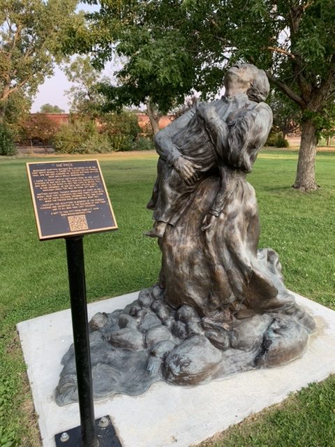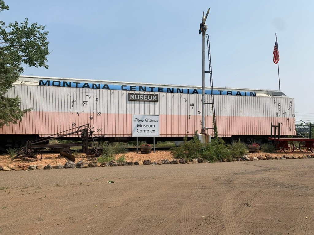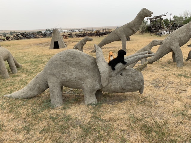 I had made a reservation at a campground in Wibaux, but there wasn’t much shade and they didn’t even give us a picnic table to cook dinner on. We spent a long while in the air-conditioned car. My mom does this lot over sitting outside in camp chairs. In this particular instance, I got it. There wasn’t a whole lot of shade and we were wedged between RVs, which is always a bit claustrophobic. Finally, I suggested we weren’t far off from Glendive. Maybe there was something to do there. I decided to check LewisandClark.Travel. We’d been to Glendive before on the cross-country trip that inspired my Lewis and Clark obsession. Makoshika State Park made quite an impression on me. It’s known for paleontological digs. A few large-scale dinosaurs have been found there, and the place reminded me of Jurassic Park. When we visited in 2018 we were in a rush to get back Minneapolis for our flight, so we didn’t explore the town much. I knew there was a dinosaur museum, but it was probably closed. I found on LewisandClark.Travel that there was a bronze sculptor in Glendive who had what was called a “sculpture walk” in town. We went to the location specified and it was highly suspect. I’m pretty sure we found her forge, not the sculpture garden I expected. We wound up giving up and going to Subway to get dinner. We found a war memorial park to eat in right by a giant cut-out of a t-rex (evidently there was supposed to be a giant dinosaur in town too. I was hoping for something kitschy, but I deduce the dinosaur was a skeleton in the dinosaur museum. At the park in the middle of town, right next to the train tracks, I chased down two white-tailed deer, trying to get a picture of them. I had middling success.