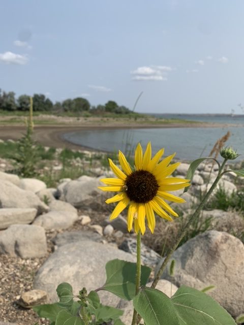I pushed on the next day all the way into North Dakota. The campground was in Pollock, SD, just on the border, so we stopped in town for a soda and took a break. My dad and I sat on a bench together in the heat, enjoying a Dr. Pepper when a man from the South Dakota tourism bureau started asking me questions about my bike. I told him about my trip, and he told me he was actually from New England, that he used to do road bike racing. It seemed like a small world situation. I mentioned LewisandClark.travel which he was familiar with and asked for advice on a campground. He mentioned a historic marker about Lewis and Clark up the road. I pushed on to the North Dakota border and it was startling how suddenly the scenery changed. Suddenly I saw the flat tops of buttes everywhere. Just over the border I tossed my bike back in the car and my dad and I took a short drive down a dirt road to take pictures before heading back to the campground. It was the first bare bones campground we’d had to camp at. There were vault toilets and there was absolutely no cell service. Ironically, the only way to book the campground was by phone, so we drove back to town. I watched my phone and told my dad to stop the second I had service. I booked a campground, we filled up on gas and asked the attendant where we might get AT&T or T-Mobile service so we could at least catch up with family before we were completely without signal. It took some searching to find the potable water spigot, but on the search we found a flushable toilet. No shower, but at least some shade at our campsite. I could see the water from my tent and perhaps more importantly, sunflowers on the shore. I was obsessed with the idea of sunflowers in South Dakota because my mom told me the first time she went there, there were sunflowers as far as the eye could see. My dad and I went for another walk by the water and I took many, many pictures.