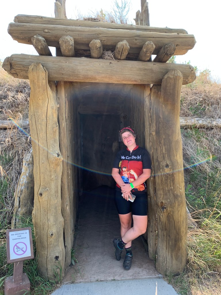 We were very close to Bismarck, and my dad was set on having someone check out my bike after the trouble I’d had. I agreed. I wanted new brakes for the mountains, and I was hoping to get a new chain ring. I got up early and got to the bike shop just before it opened. Larson’s knows what they’re doing. They took me immediately, despite a backlog because I’m touring. They were done by the afternoon! We spent part of the morning in a coffee shop, then went to Double Ditch, across the river in Mandan. It was an archaeological site. It was a Mandan settlement. Thousands of people lived there through the 18th century, when it slowly shrunk as their people died of smallpox and eventually spread out further upriver. It was not settled when Lewis and Clark were here, but it hadn’t been abandoned for long. I learned a lot and I got a joyful reminder of how much I already knew, after reading Encounters at the Heart of the World, a book about the Mandans.