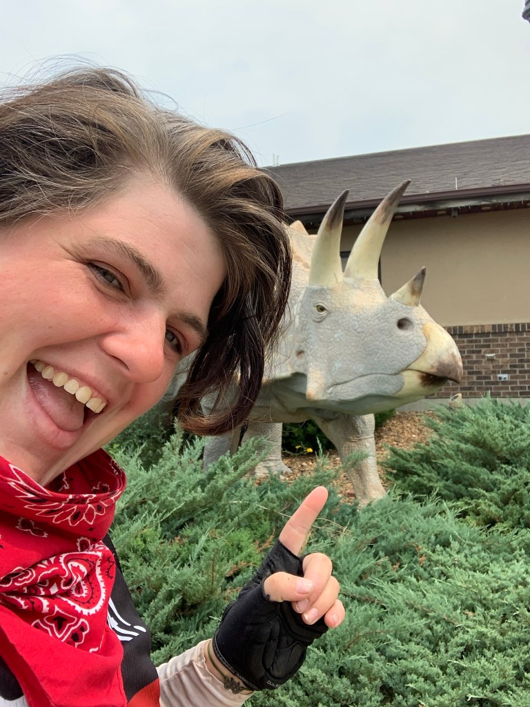 Next morning we went back to Glen Ullin and I biked toward Dickenson. We met up in Hebron and I tried huckleberry soda for the first time at a cute little coffee shop called Dark Side of the Brew. If a town has a population of more than 500 people, they usually have a coffee shop. This had been especially true for North Dakota and would continue to be true in Montana down the road. There were a few museums I wanted to check out in Dickenson before they closed at 5pm. I never enjoy feeling like I’m on a time crunch. It’s always tough to judge how difficult the road is going to be up ahead. Sometimes there’s unexpected detours or flat tires. I didn’t want to get to town just before the museums closed and not get to experience them. So my mom and I decided to take a lunch break and come back later to finish out my ride. There was a museum center with a dinosaur museum, my primary interest, and a museum on local history and culture. Some highlights (beyond dinosaurs), included their mineral collection, including florescent rocks that lit up like a psychedelic poster under blacklights, a collection of women’s hats and displays on North Dakota through the decades complete with outfits. I completed my ride for the day, made my mileage goal and had tacos for dinner. I had officially finished yet another map, and therefore another leg of my journey.