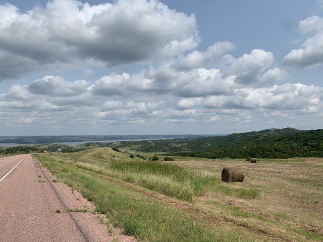 I put my bike in his car and he drove me back toward Akaska, nine miles in the direction I should have gone, and dropped me off so I could continue down my route without adding crazy numbers to my mileage. I stopped for the day after costing down a beautiful, long hill. I hit my mileage. The next morning, I would start on an equally long uphill. Once again, we stayed at a recreation area. So many of these places had kayak rentals, paddleboard rentals. Every time I saw the option I was mercilessly tempted, but I had exerted myself all day. Maybe I’d kayak on a day off, but if it didn’t work out with my dad, it probably wasn’t going to happen. Once again we went for a walk down by the water and enjoyed the breeze.