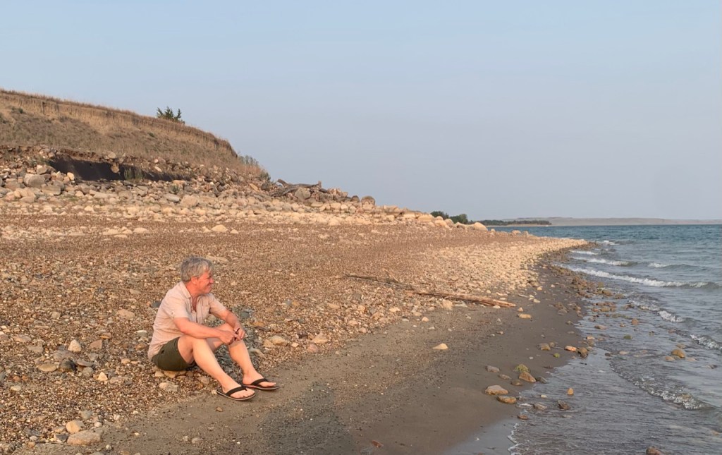 We decided to take the opportunity to go out on a car ride and explore. We found a nature preserve out on Lake Oahe with a boat launch and a silty beach and I went out to dip my toes in the Missouri for the first time. I took off my shoes and alked along the store. I sunk suddenly calf deep in muck. Shouting and laughing I struggled back toward more solid ground while my dad skipped rocks on the water.