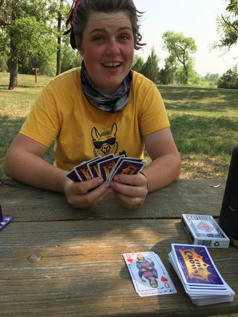 We ran some errands. I got another thermos for ice water, and purchased the game Five Crowns. We’d learned that having something to occupy our time in the hours we spent at campgrounds would make the days go by. We spent the afternoon drinking ice water in the recreation area of our campground. I taught my dad Five Crowns and I think I got him hooked. Our campground was city run but it was huge and high quality. Plenty of shade, a disk golf course. We decided on a whim to run out again and buy some cheap frisbees so we could try our hand at disk golf. There was supposed to be a disk golf in the dark event there tonight and the idea of disk golf with led lights or disks that glow in the dark was incredibly tempting. Shortly after we finished our tester round though, the winds picked up. We had a campfire going (we were allowed to at this campground) when it started to rain). I was paranoid about setting the plains states on fire, so I went off with one of my giant thermoses to get water to put out the fire when we were done. Limbs were crashing down from the trees. I saw someone in a camp hammock swinging violently back and forth.
