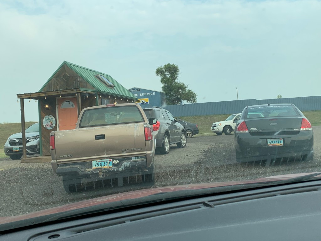 The next morning I was a bit obsessed with the idea of getting coffee. I got on highway 200 and headed west, and sent my mom on ahead, evidently too far up the highway. I knew we were meant to turn toward Beulah, ND. My maps are pretty complicated to get used to. It’s not one map that covers the entire leg of my journey, but a bunch of smaller maps that constantly change orientation. There are way markers that measure mileage and letters to mark when there are turns, but it can be difficult to find where you are if you don’t study it, especially if you don’t start and end at the same waymarker. I kind of sent my mom out into the wilderness. I had her take a picture of the maps for that day, but that was all. I thought I’d meet with my mom right before the turn. As it turned out, that’s where some heavy duty road work started. My mom was on the other end of the mess when I texted her hinting we should meet at the coffee shop. She didn’t want to come back through it. I was pretty sure I was going to get a coffee either way, even if I just took a detour and biked there… Then I realized my mistake and I had to apologize and ask her to come back. We met at the coffee shop. I got there first and awkwardly waited in the parking lot for about ten minutes. It was more of a coffee hut than a shop. Drive-thru only, and businesses don’t generally take kindly to bicycles in their drive-thrus. There were a lot of cars and it was a long wait.