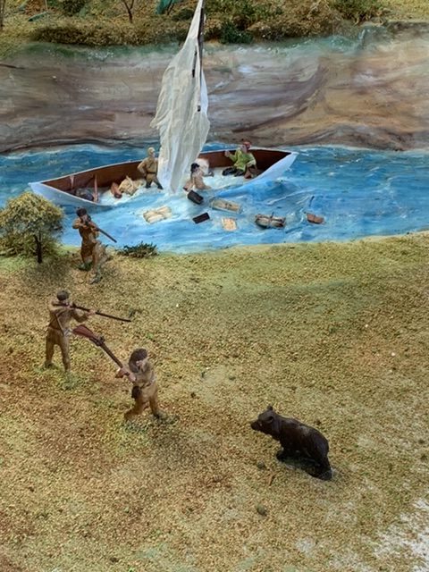 At the end of the hall I entered the Lewis and Clark section of the interpretive center. It was a completely different experience from any center I’d been to so far. It started with an animatronic Newfoundland, Seaman. If you pushed a button he moved and barked at a little prairie dog in a cage. There were stations after that where you picked up a little booklet. You got to choose who you were, either a named man on the expedition or a position like hunter or translator. Obviously I chose Meriwether Lewis. You put the first page of the booklet in and stamped it. As you went through the exhibits they each had a stamp station and you filled up your booklet by visiting each part of the exhibit in order.